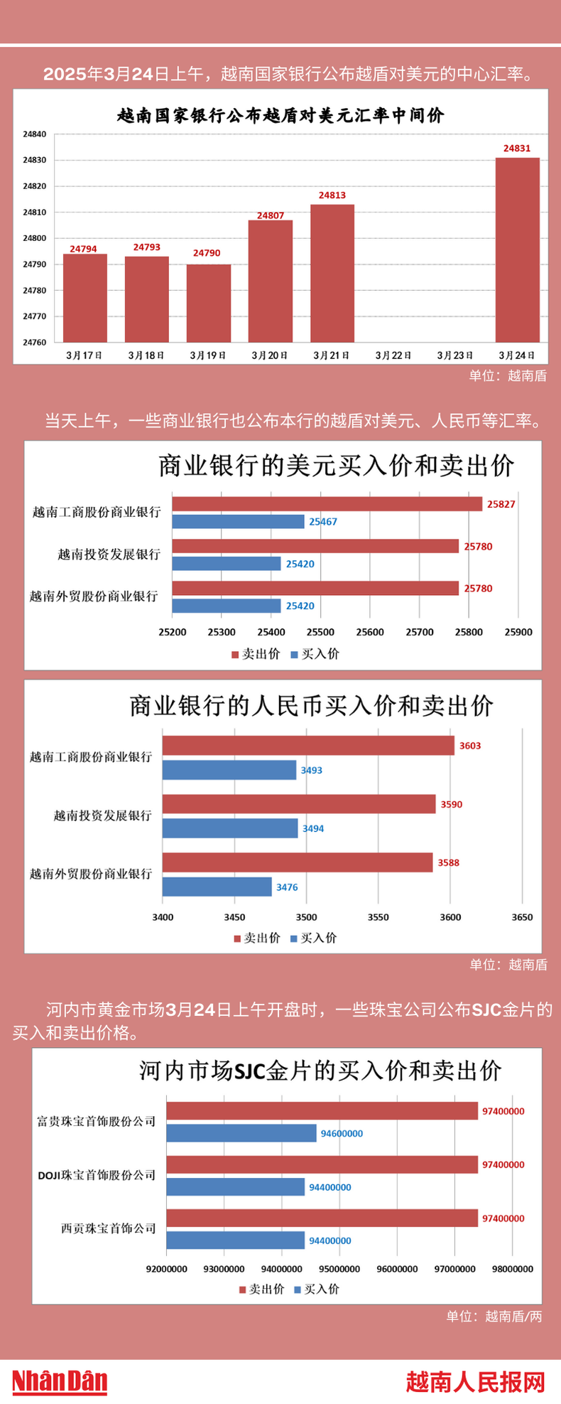 2025年3月24日上午,越南国家银行所公布的越盾对美元的中心汇率为24831。