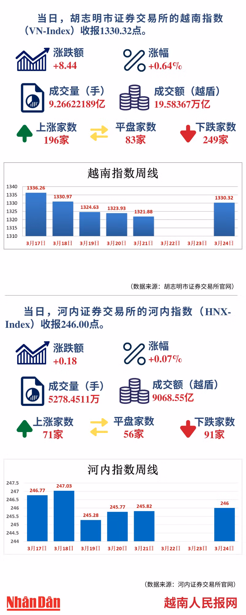 当天,胡志明市证券交易所的越南指数(VN-Index)和河内证券交易所的河内指数(HNX-Index)分别收报1330.32点和246点。