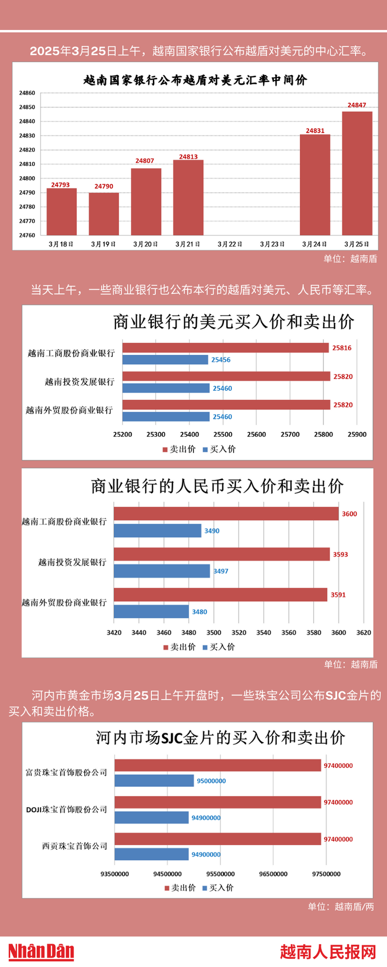 2025年3月25日上午,越南国家银行所公布的越盾对美元的中心汇率为24847越南盾。