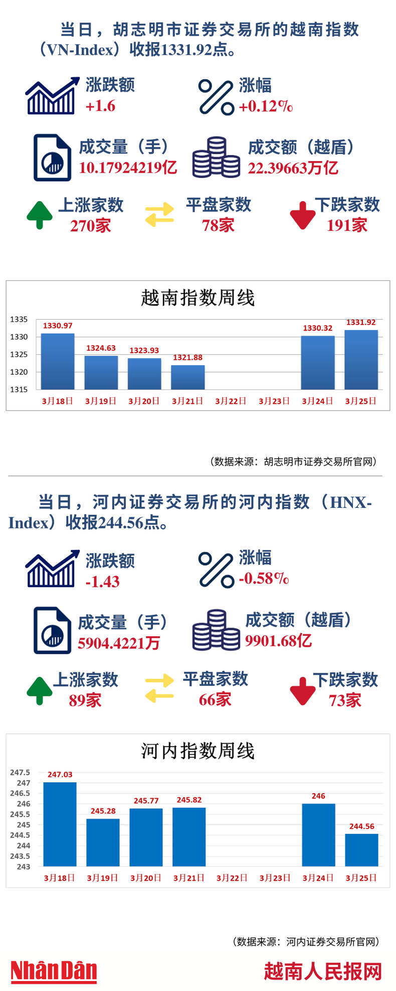 当天,胡志明市证券交易所的越南指数(VN-Index)和河内证券交易所的河内指数(HNX-Index)分别收报1331.92点和244.56点。