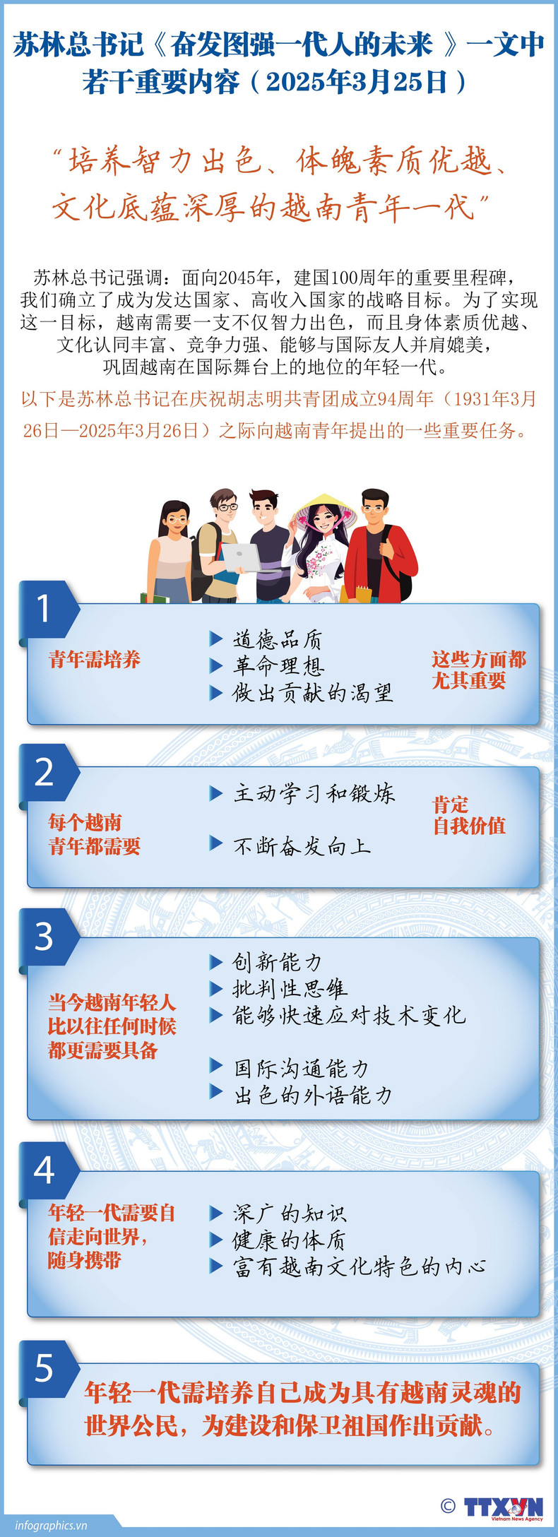 越共中央总书记苏林在2025年3月25日的《奋发图强一代人的未来 》一文中强调:面向2045年,建国100周年的重要里程碑,我们确立了成为发达国家、高收入国家的战略目标。为了实现这一目标,越南需要一支不仅智力出色,而且身体素质优越、文化认同丰富、竞争力强、能够与国际友人并肩媲美,巩固越南在国际舞台上的地位的年轻一代。