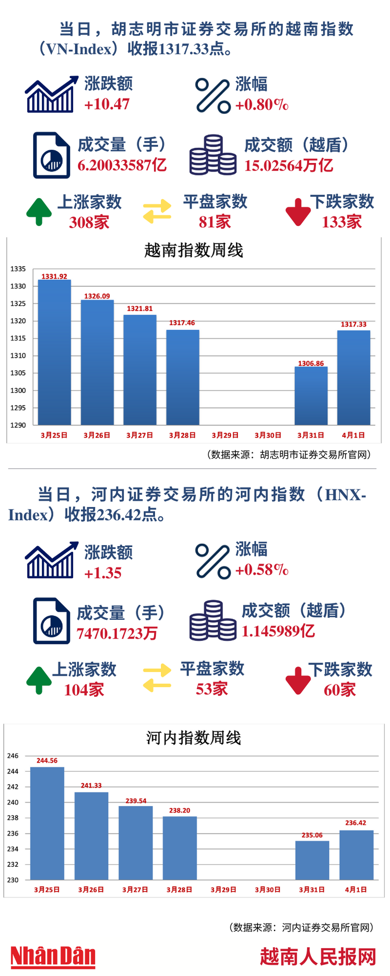 2025年12月01日星期一 20:43 12月1日越南证券市场数据一览 【图表新闻】 当天,胡志明市证券交易所的越南指数(VN-Index)和河内证券交易所的河内指数(HNX-Index)分别收报1701.67点和257.91点。