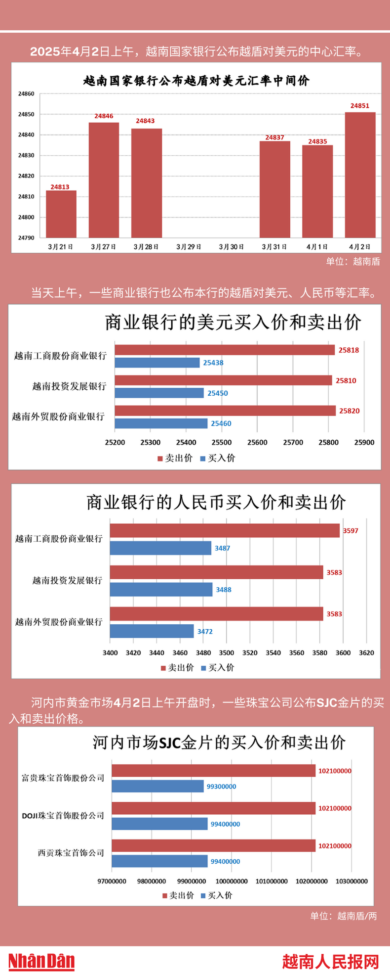 2025年4月2日上午,越南国家银行所公布的越盾对美元的中心汇率为24851。