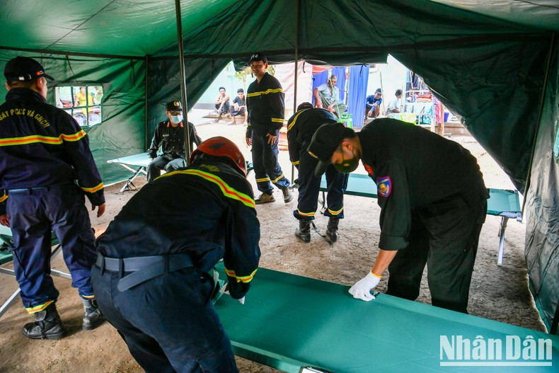 越南公安部赴缅甸救援队指挥员阮明姜上校率领救援队官兵代表团直接为该医院捐赠用于患者检查、治疗和护理的2顶野战帐篷。每顶帐篷可容纳约10至12名患者。