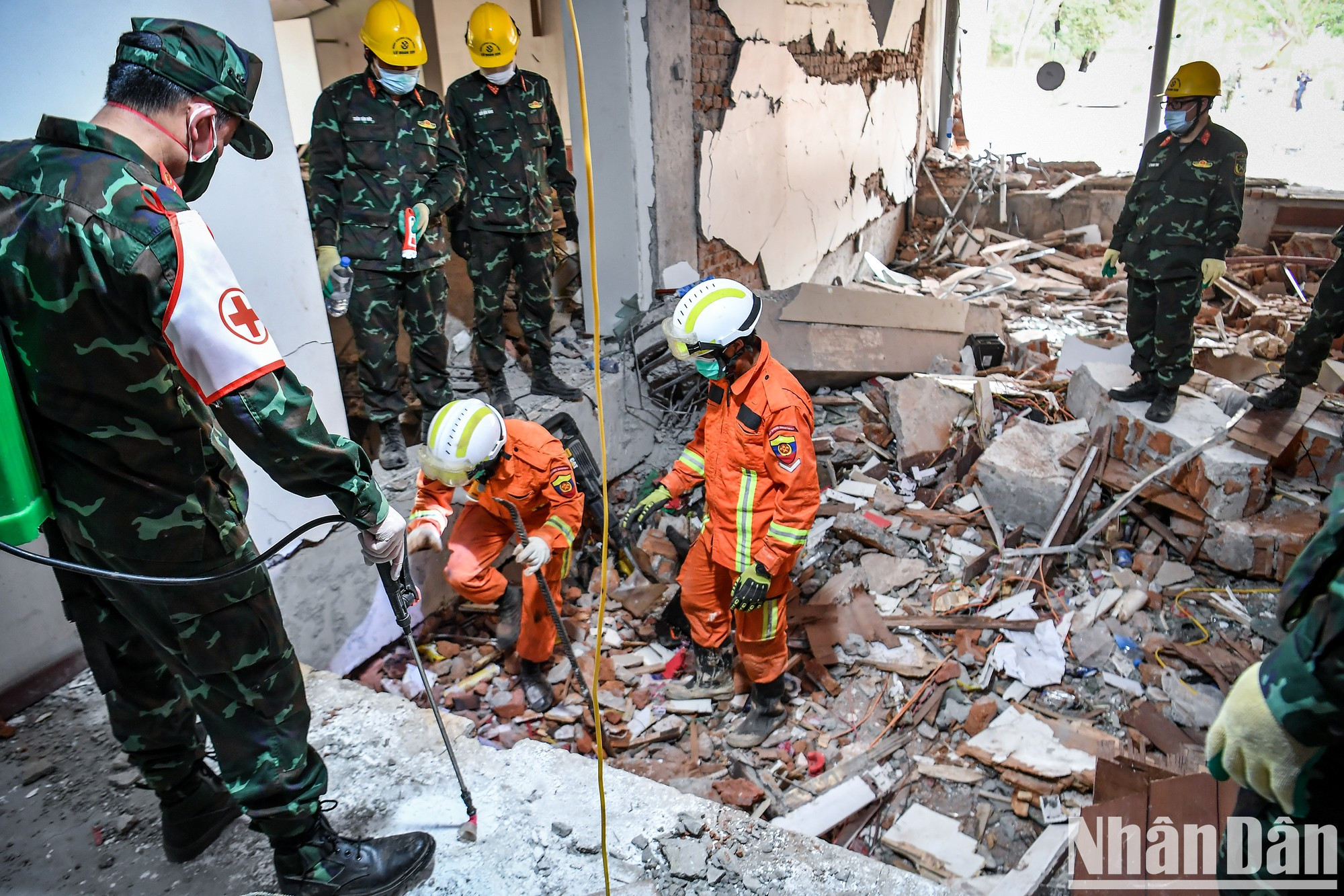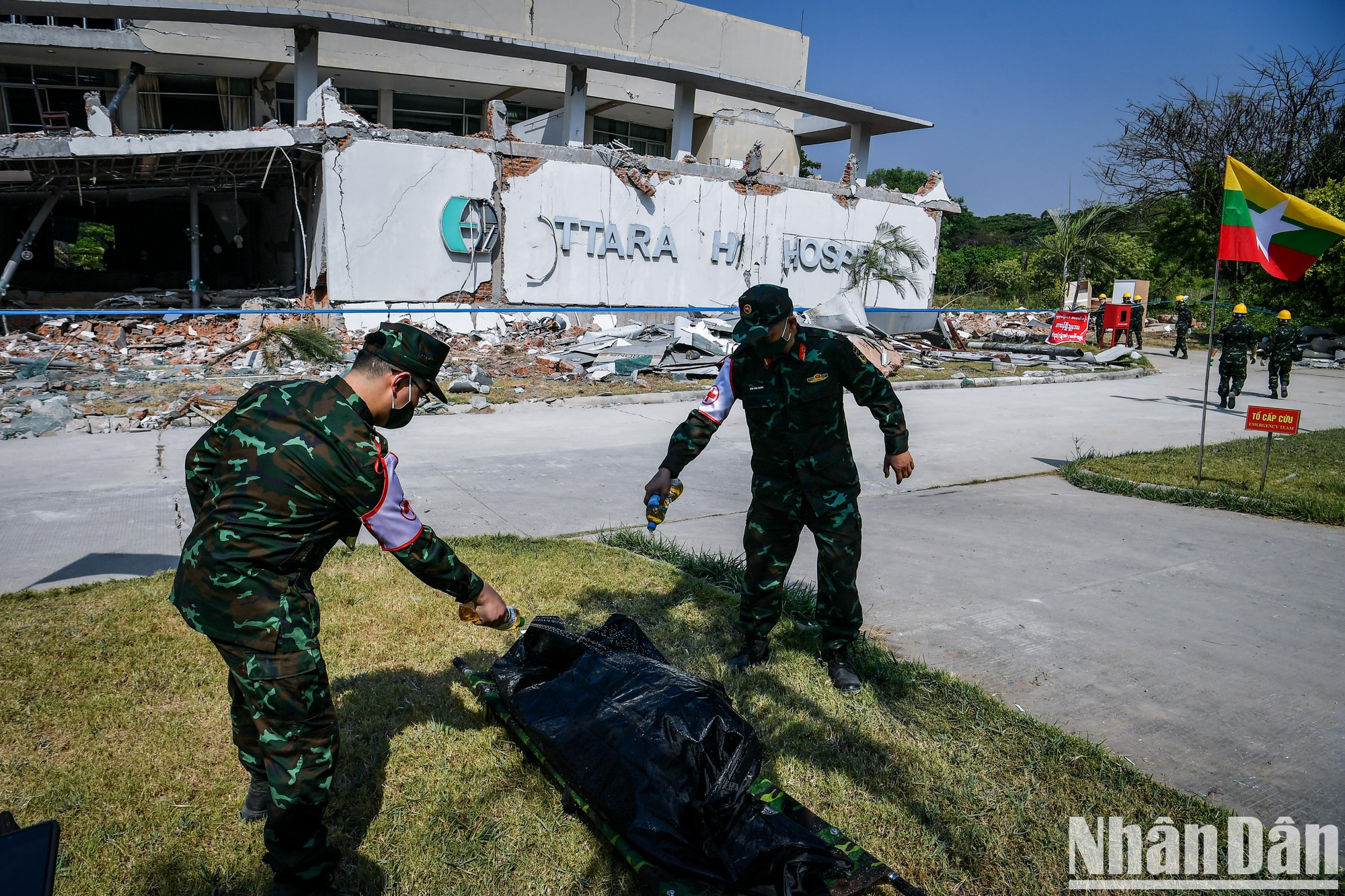 越南103中央军医院救灾队在缅甸地震现场开展救援活动。