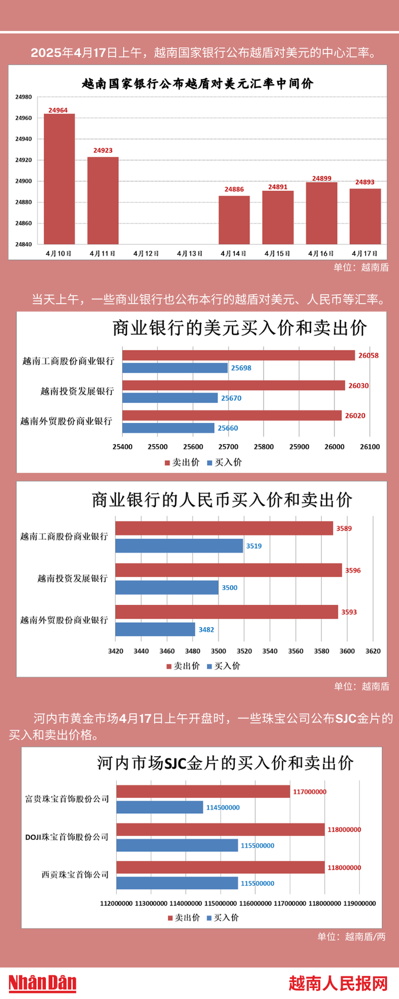 2025年4月17日上午,越南国家银行所公布的越盾对美元的中心汇率为24893。