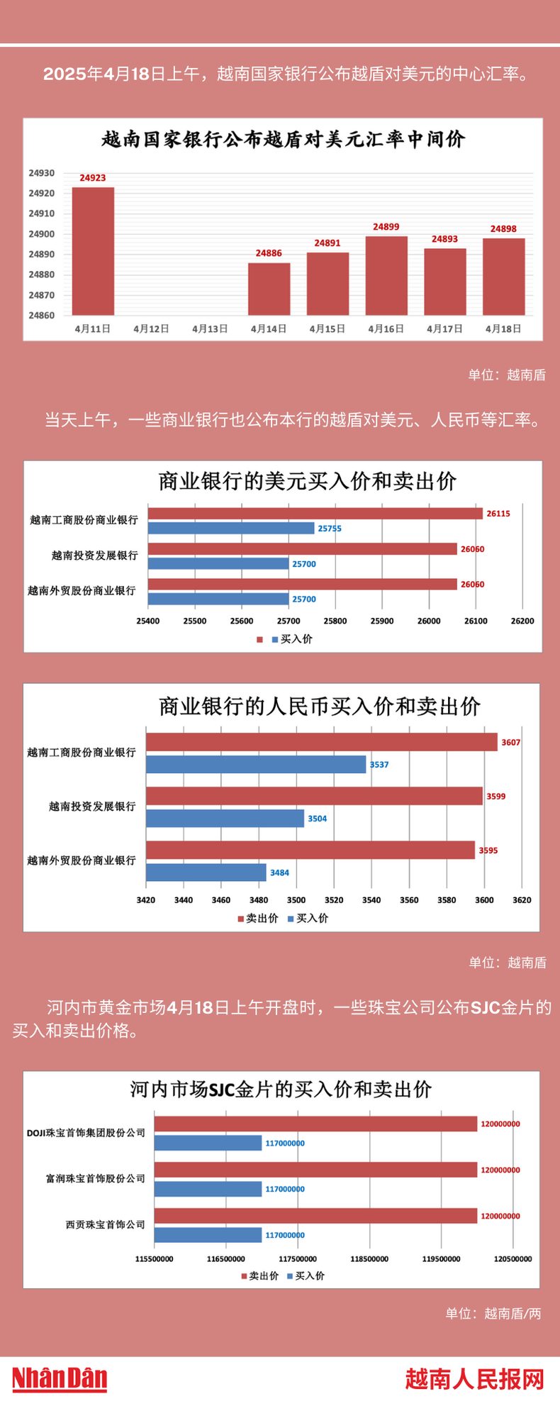 2025年4月18日上午,越南国家银行所公布的越盾对美元的中心汇率为24898。