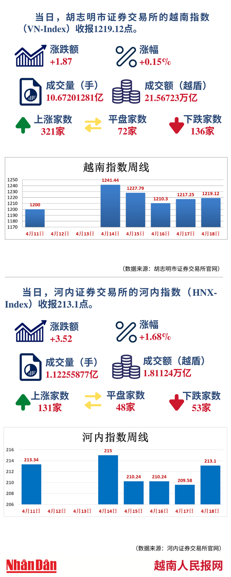 当天,胡志明市证券交易所的越南指数(VN-Index)和河内证券交易所的河内指数(HNX-Index)分别收报1219.12点和213.1点。