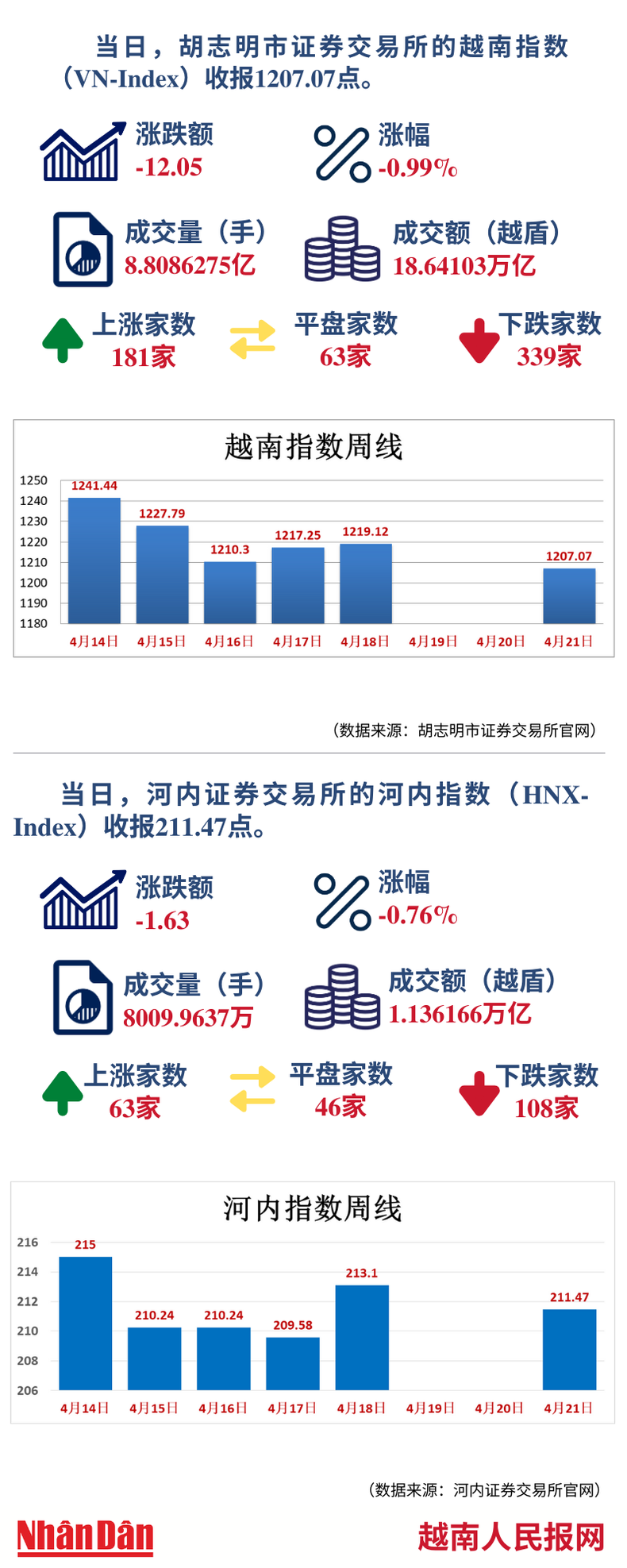 当天,胡志明市证券交易所的越南指数(VN-Index)和河内证券交易所的河内指数(HNX-Index)分别收报1207.07点和211.47点。