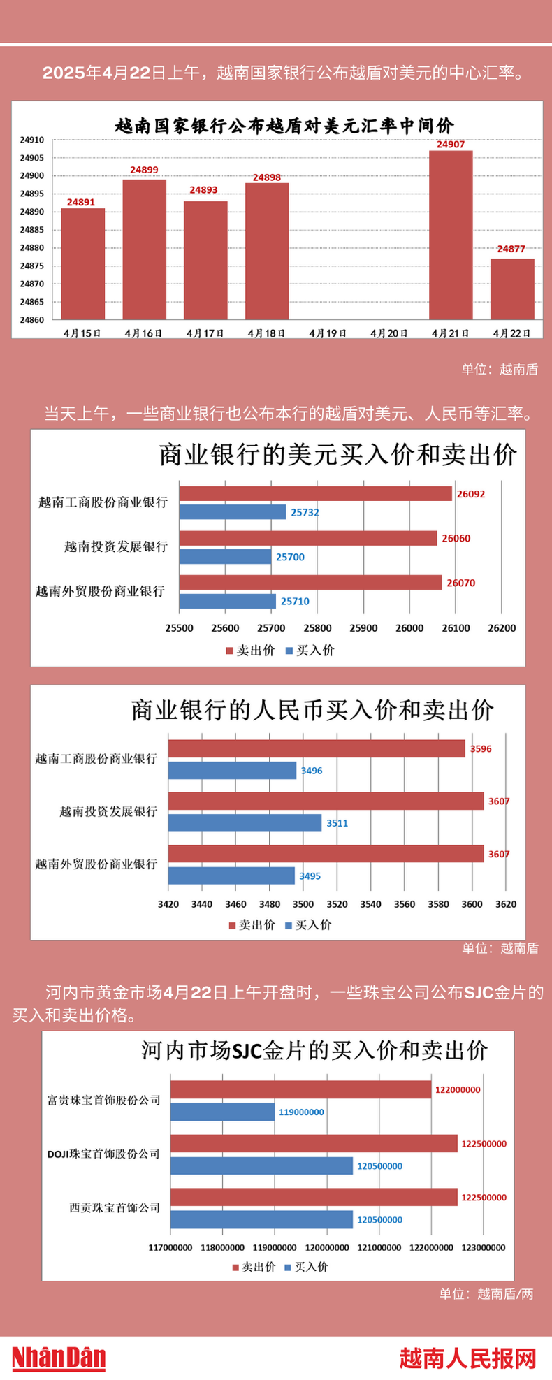 2025年4月22日上午,越南国家银行所公布的越盾对美元的中心汇率为24877。