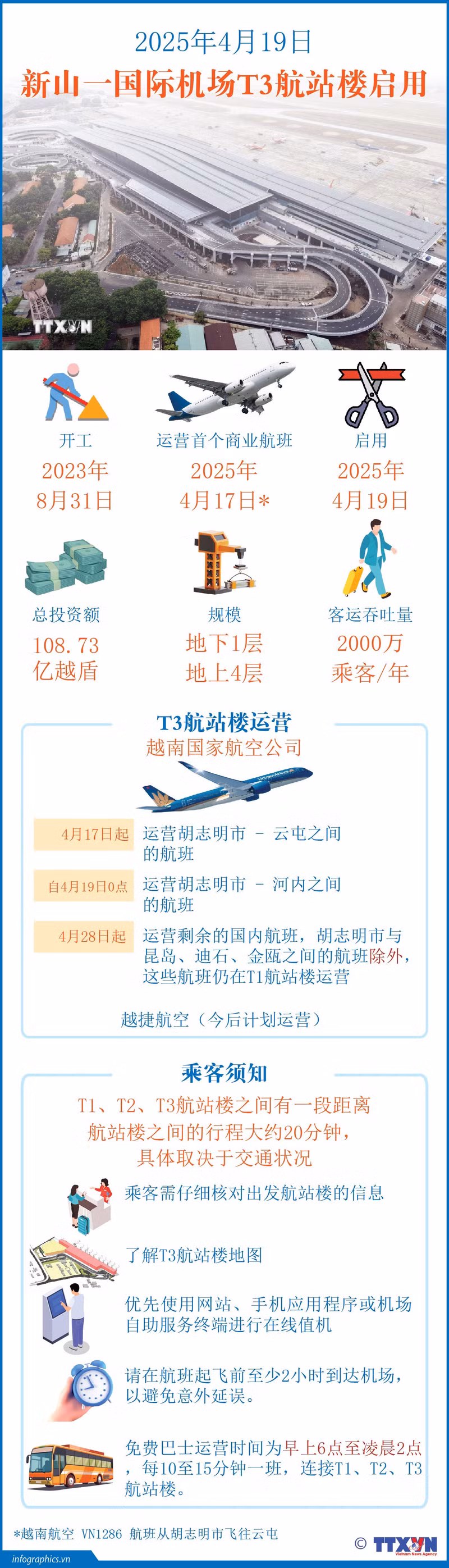 新山一国际机场T3航站楼在政府总理范明正的主持下于2025年4月19日正式开通,比原计划提前两个月完成。这是越南最大的国内航站楼,每年可接待 2000 万人次,使新山一机场的总吞吐能力达到 5000 万人次。