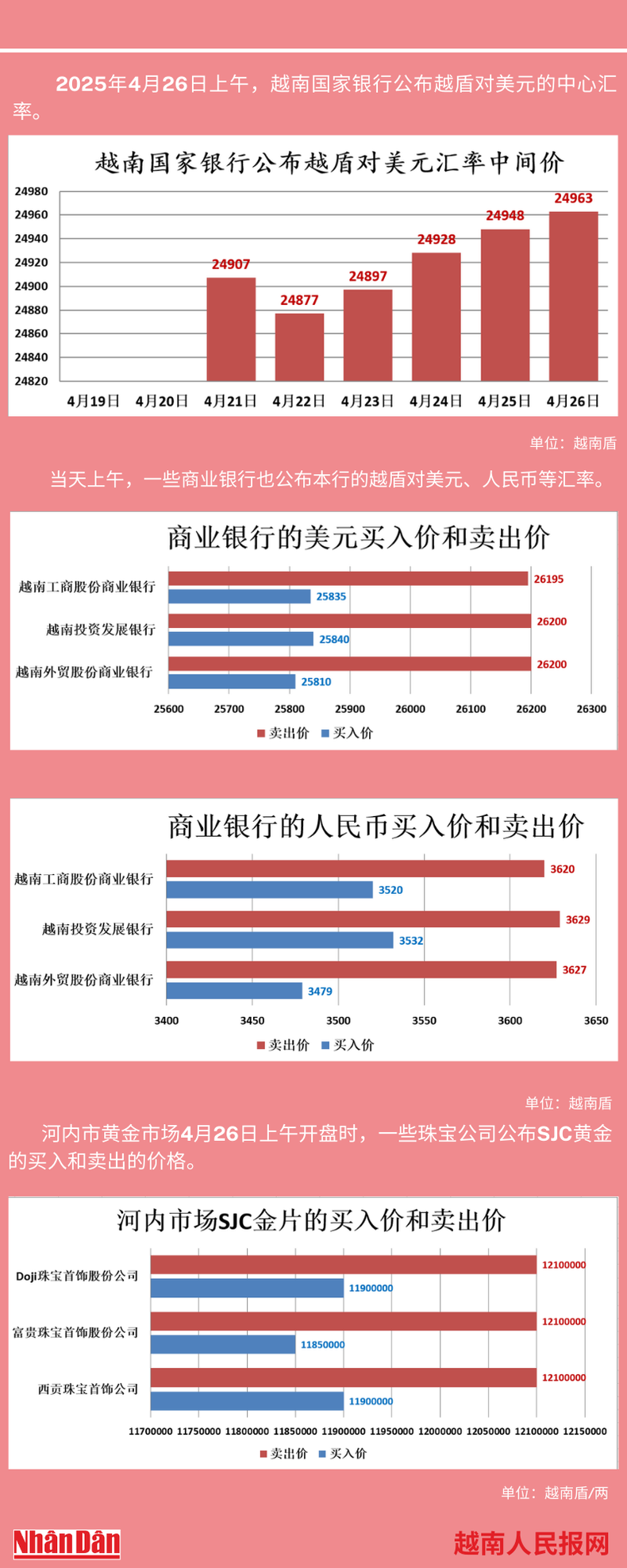 2025年4月26日上午,越南国家银行所公布的越盾对美元的中心汇率为24963。