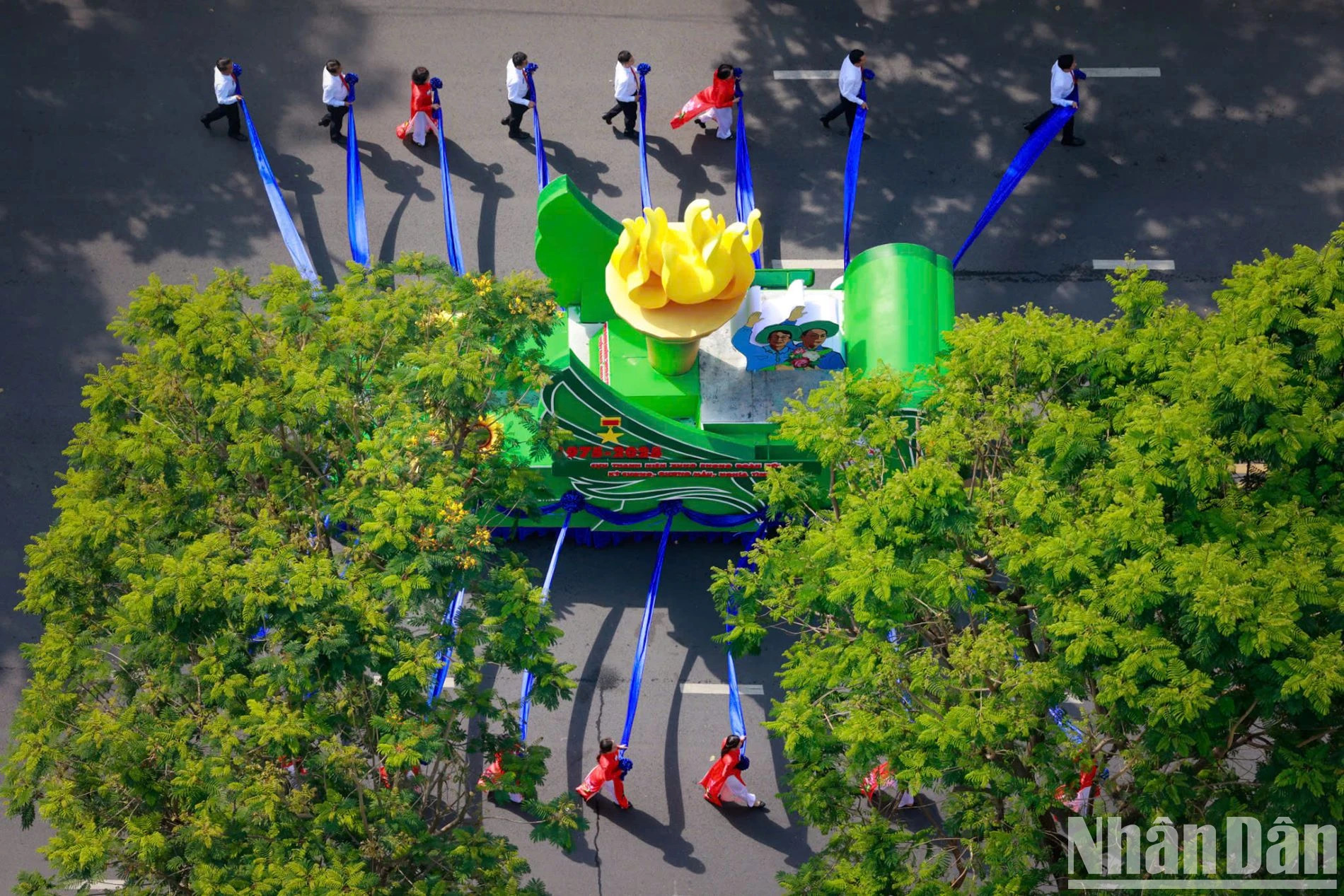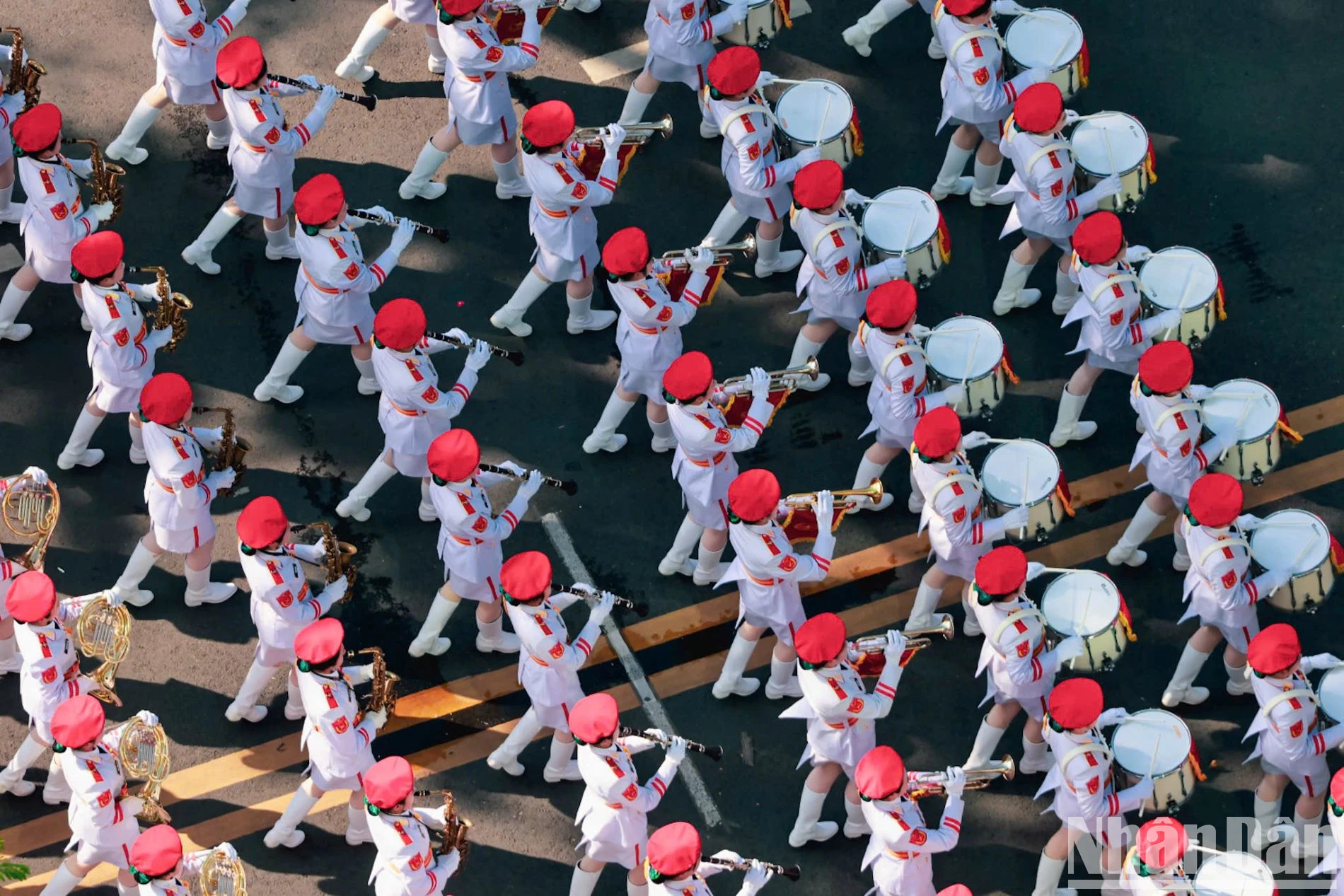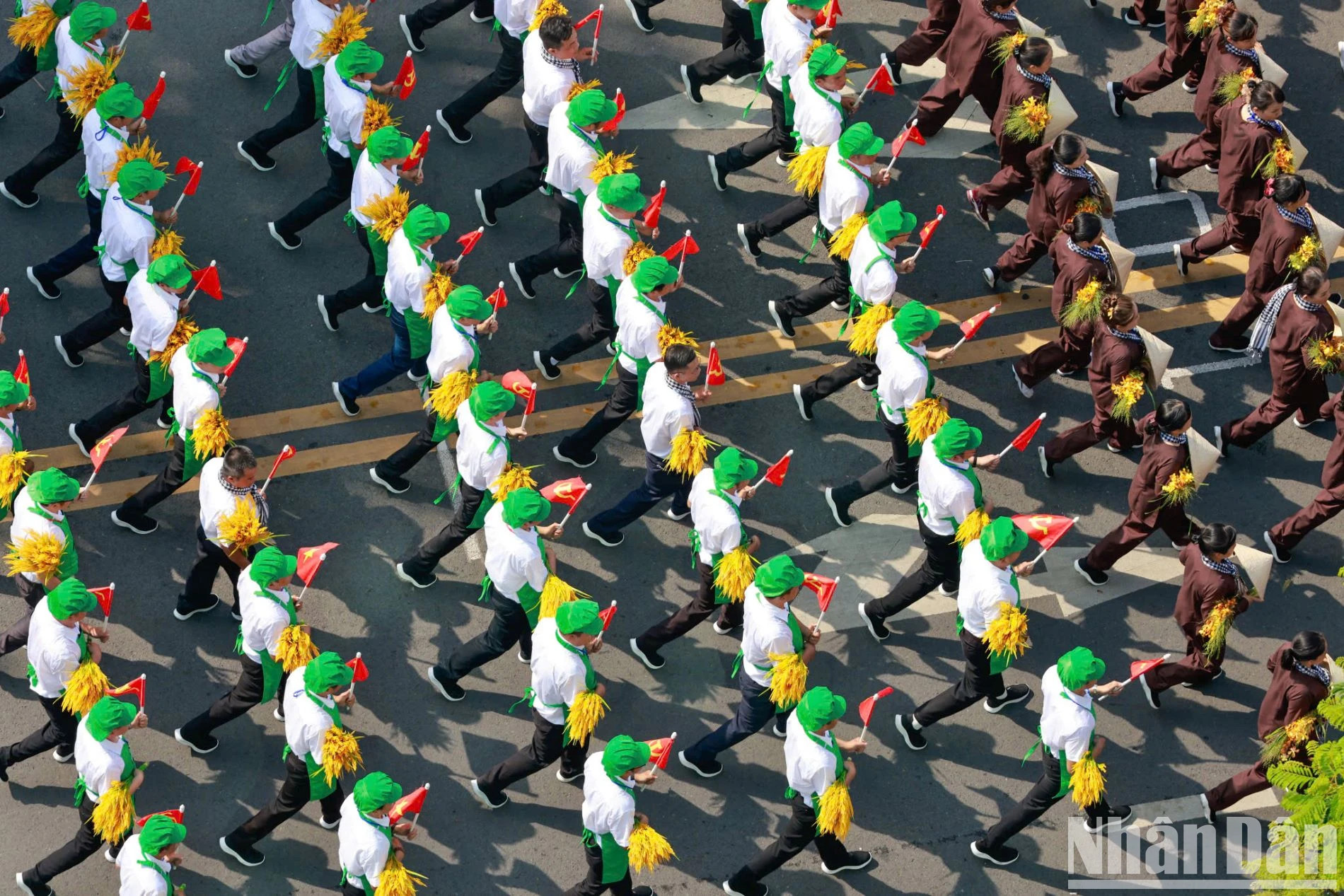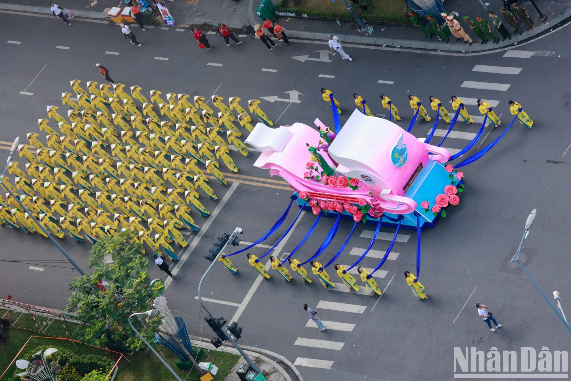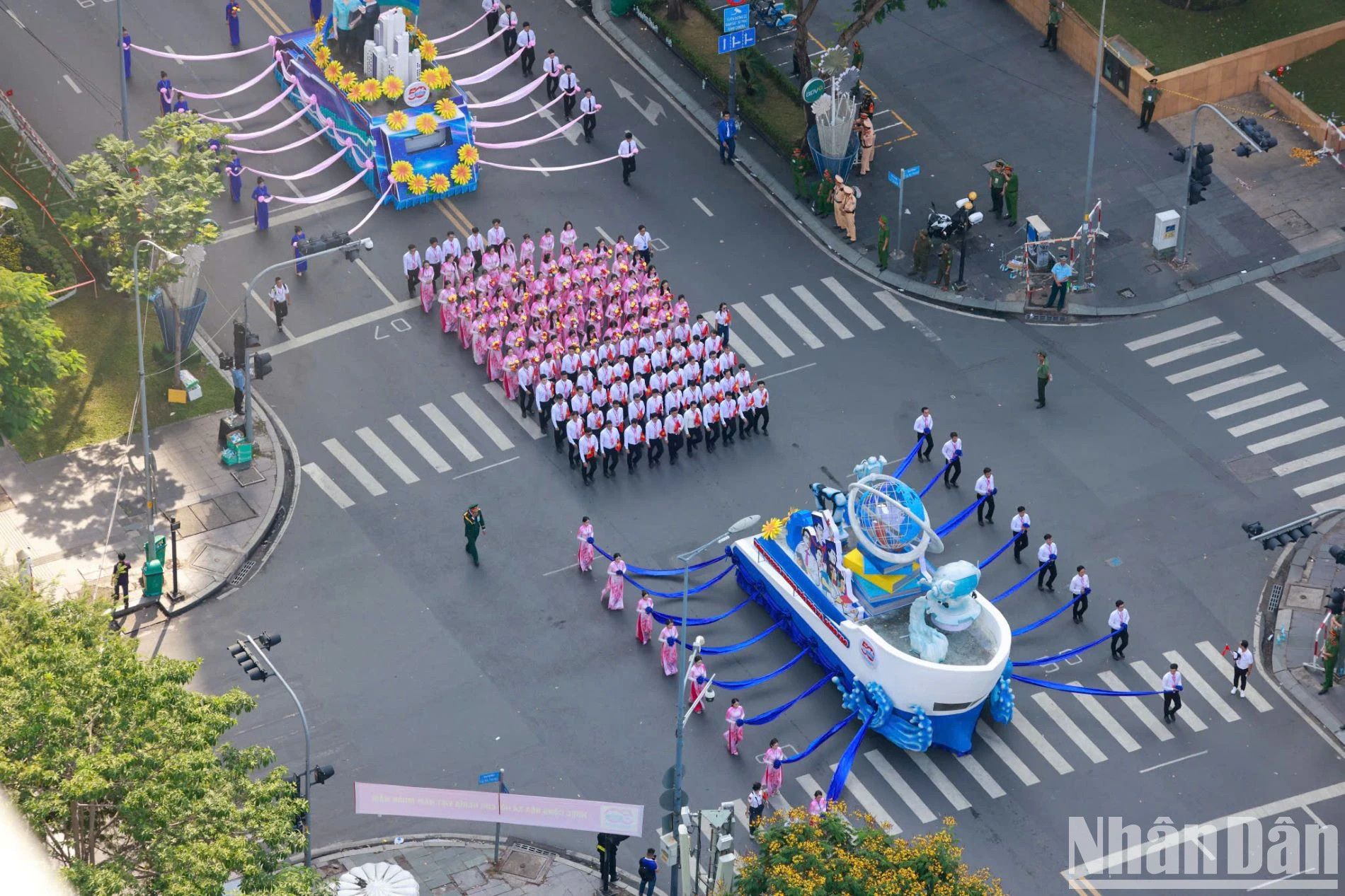 从高空处捕捉2025年4月30日在胡志明市举行的南方解放、国家统一50周年庆典各阅兵、游行方阵的特别时刻。