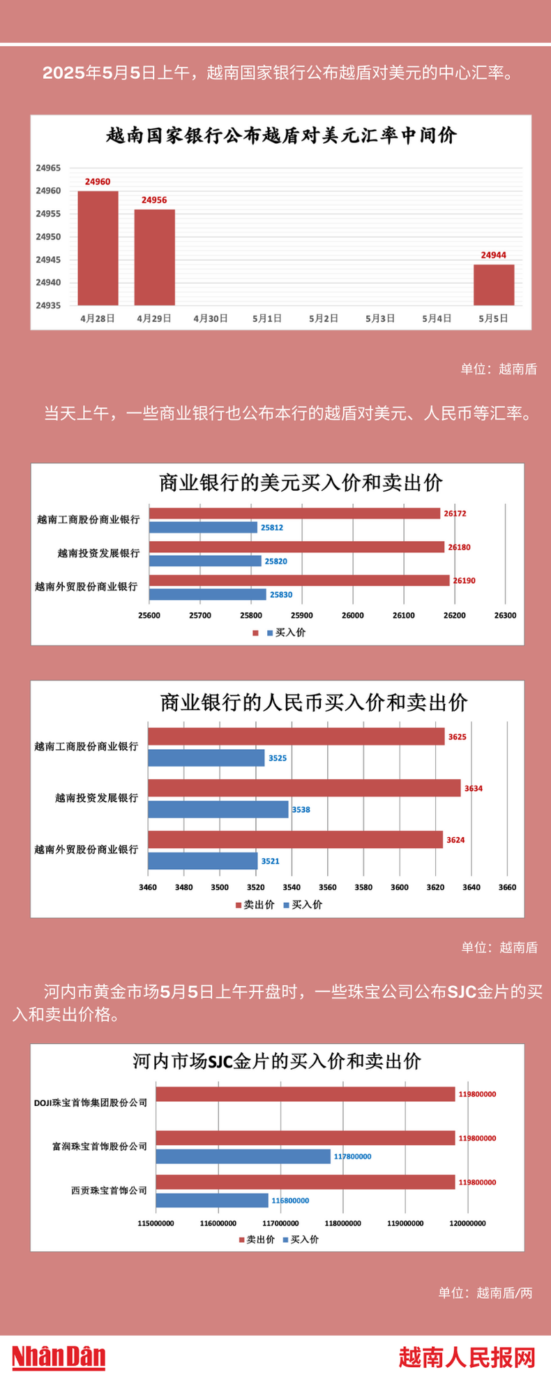 2025年5月5日上午,越南国家银行所公布的越盾对美元的中心汇率为24944。