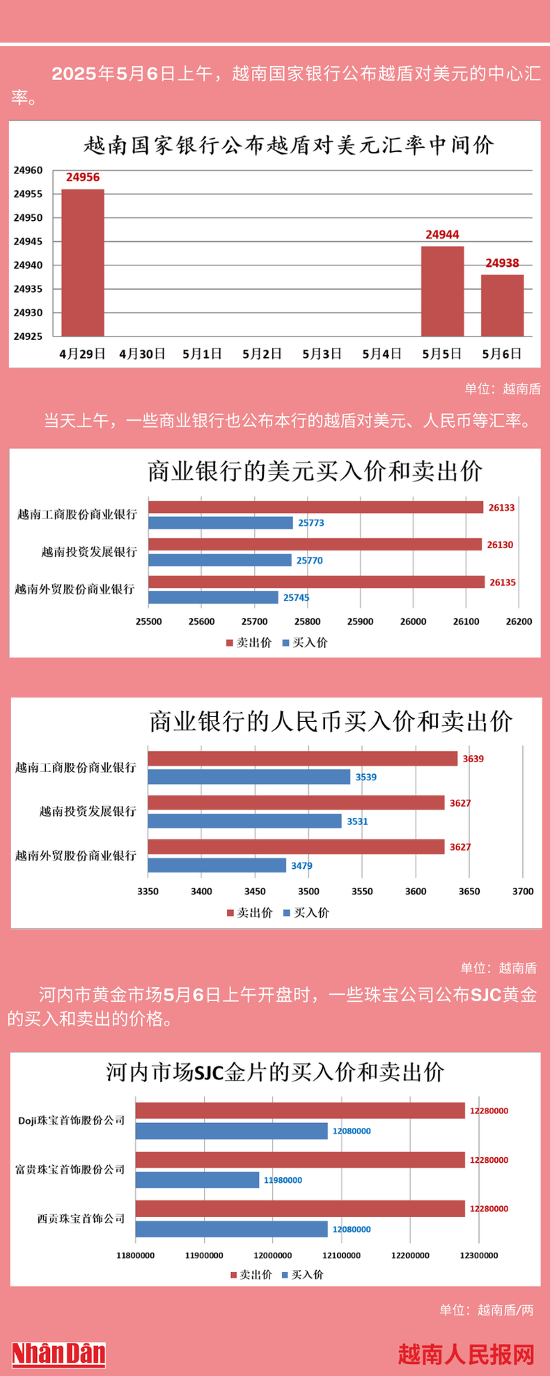 2025年5月6日上午,越南国家银行所公布的越盾对美元的中心汇率为24938。