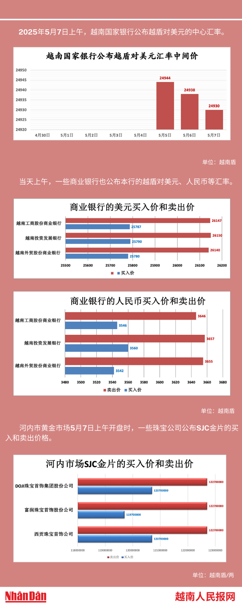 2025年5月7日上午,越南国家银行所公布的越盾对美元的中心汇率为24930。