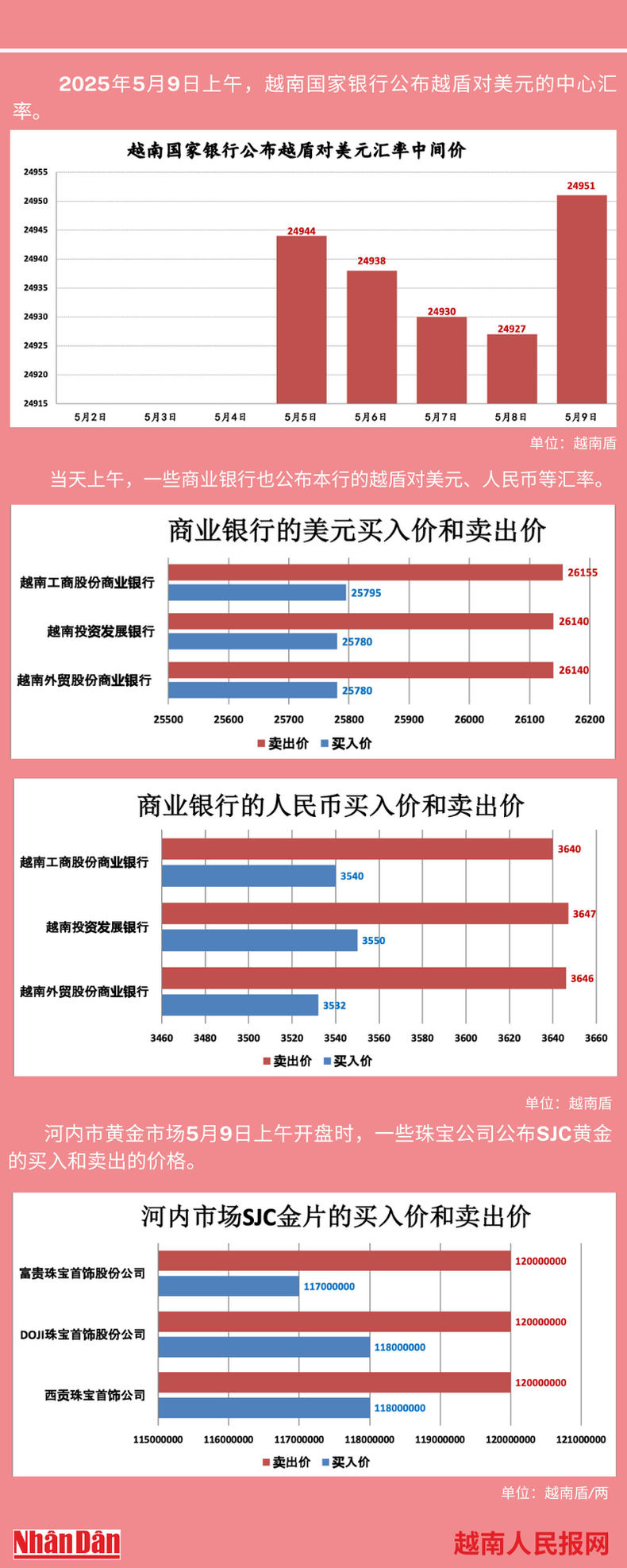 2025年5月9日上午,越南国家银行所公布的越盾对美元的中心汇率为24951。