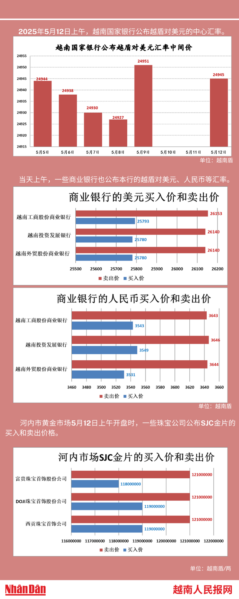 2025年5月12日上午,越南国家银行所公布的越盾对美元的中心汇率为24945。