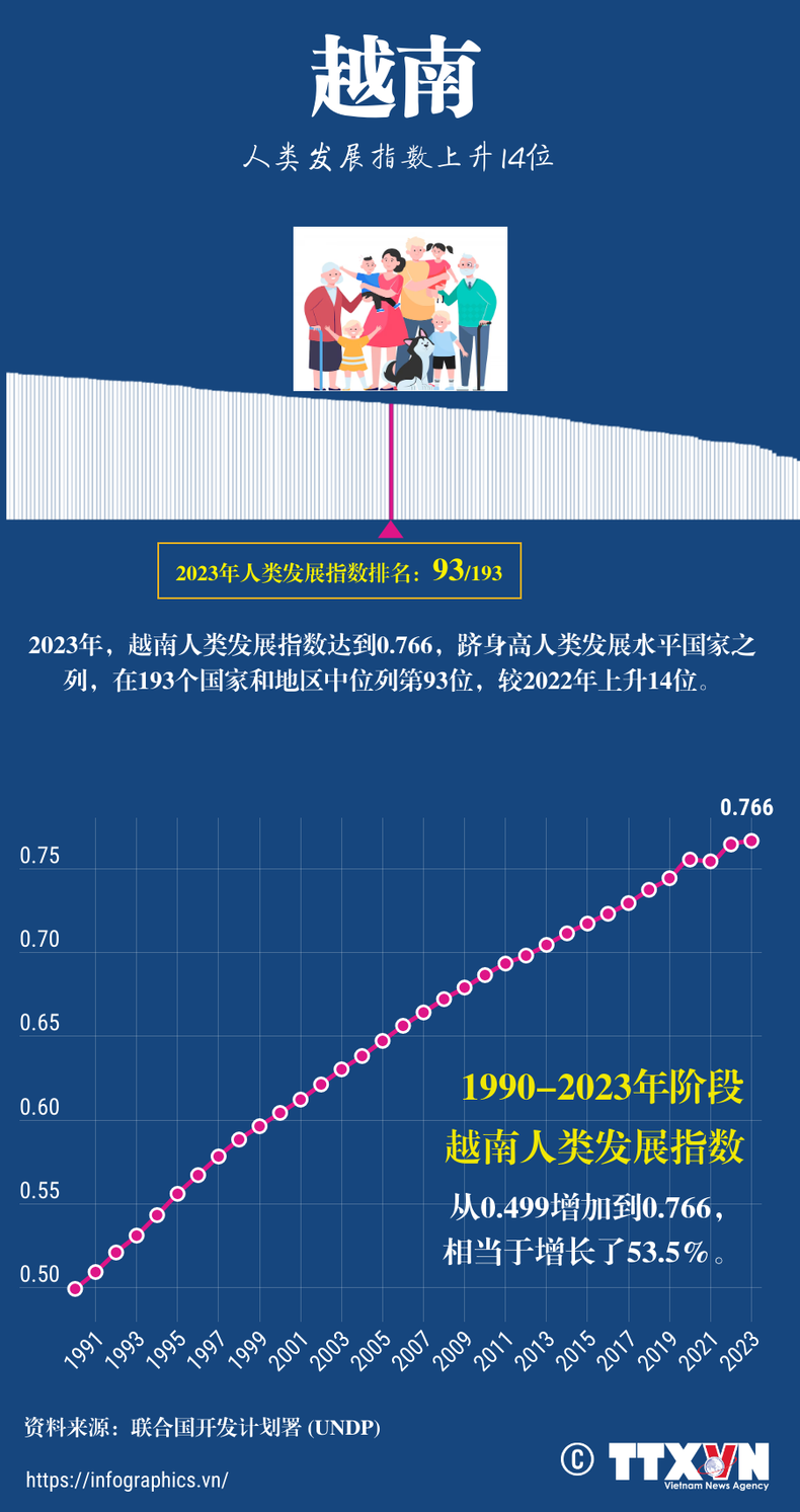 2023年,越南人类发展指数达到0.766,跻身高人类发展水平国家之列,在193个国家和地区中位列第93位,较2022年上升14位。