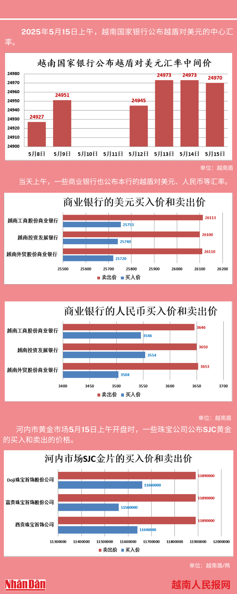 2025年5月15日上午,越南国家银行所公布的越盾对美元的中心汇率为24970。