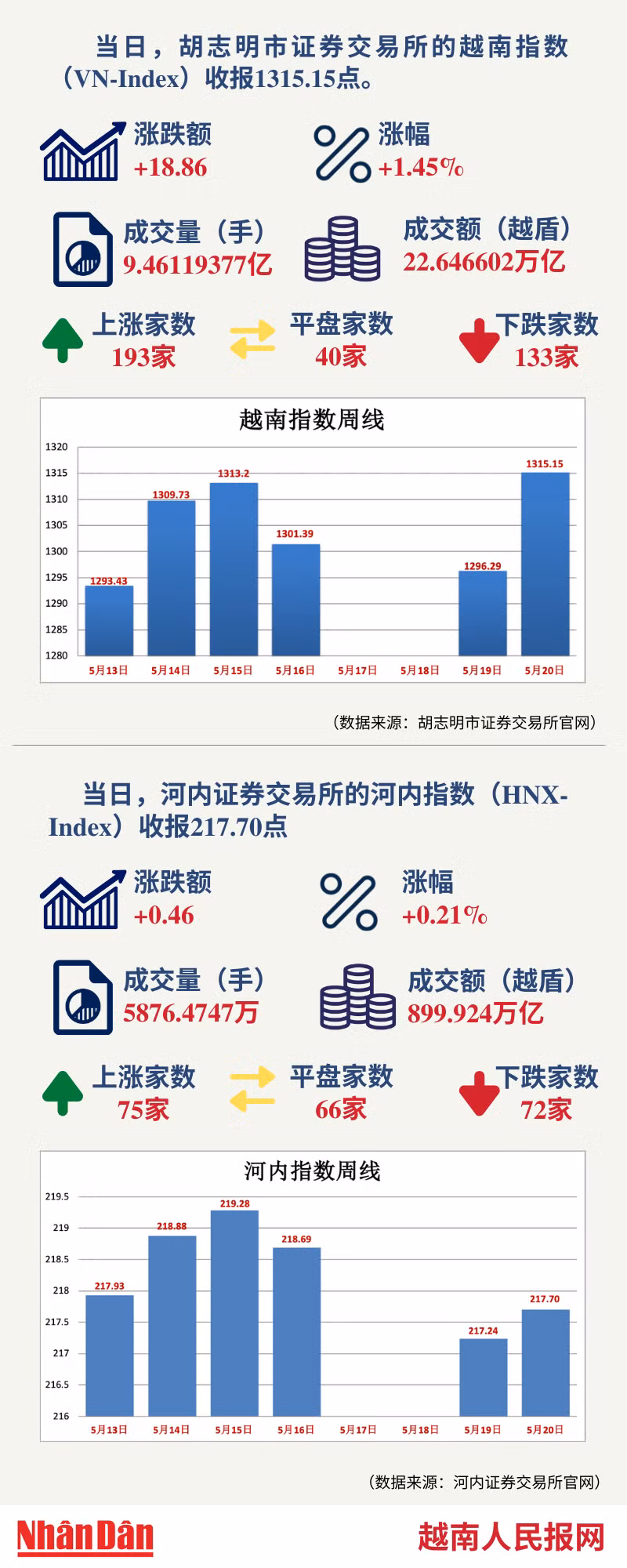 当天,胡志明市证券交易所的越南指数(VN-Index)和河内证券交易所的河内指数(HNX-Index)分别收报1315.15点和217.70点。