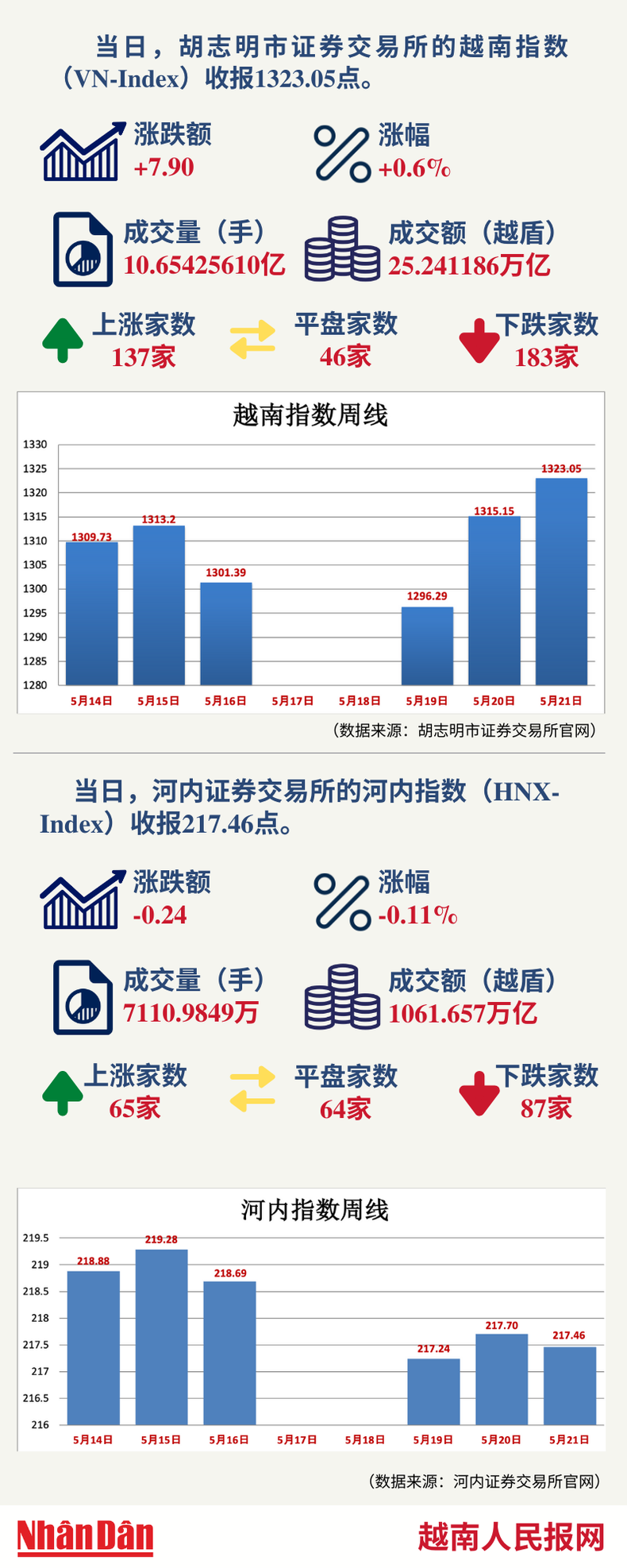 当天,胡志明市证券交易所的越南指数(VN-Index)和河内证券交易所的河内指数(HNX-Index)分别收报1323.05点和217.46点。