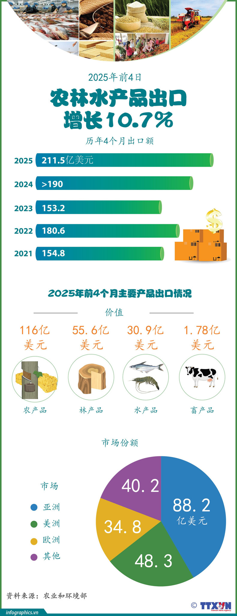 据越南农业与环境部统计,2025年前4个月,农林水产品出口总额达211.5亿美元,同比增长10.7%。 其中,农产品出口额达116亿美元,林产品出口额达55.6亿美元,水产品出口额达30.9亿美元,畜产品出口额达1.78亿美元。