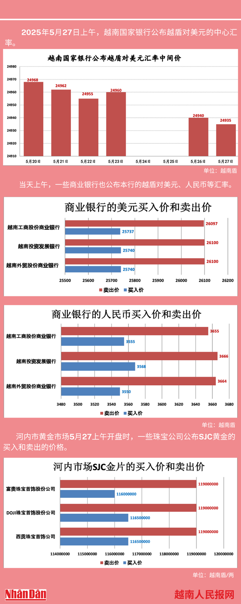 2025年5月27日上午,越南国家银行所公布的越盾对美元的中心汇率为24935。