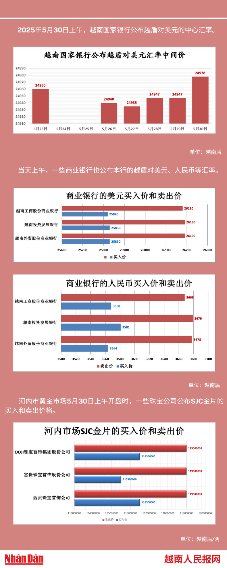 2025年5月30日上午,越南国家银行所公布的越盾对美元的中心汇率为24978。