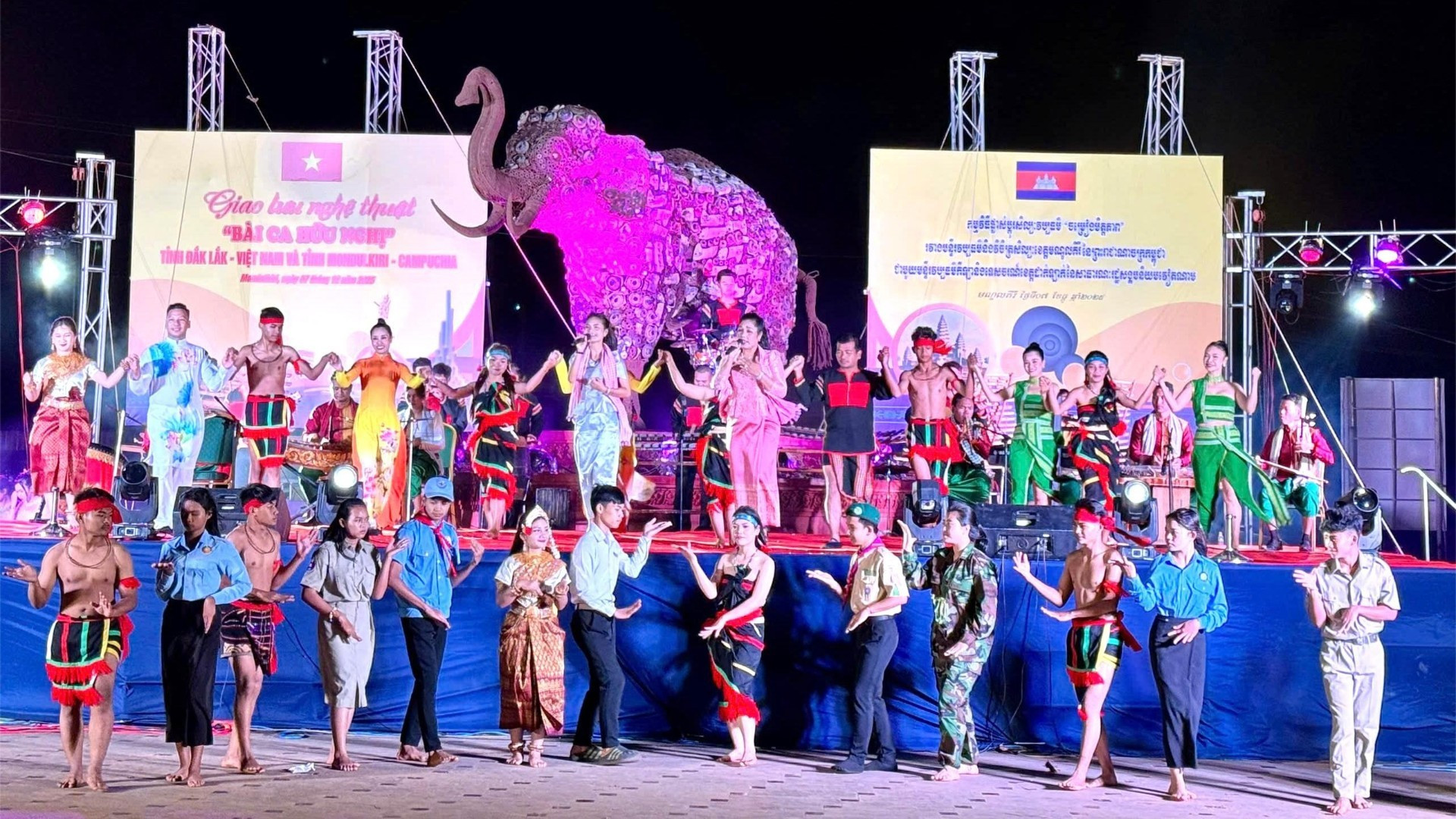 越南得乐省和柬埔寨蒙多基里省领导和参加演出的歌手、艺术家合影。