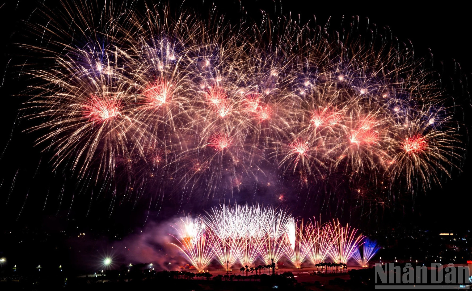 1月23日晚,河内上空被大规模烟花表演的多层绚丽效果照亮,庆祝越南共产党第十四次全国代表大会圆满闭幕。