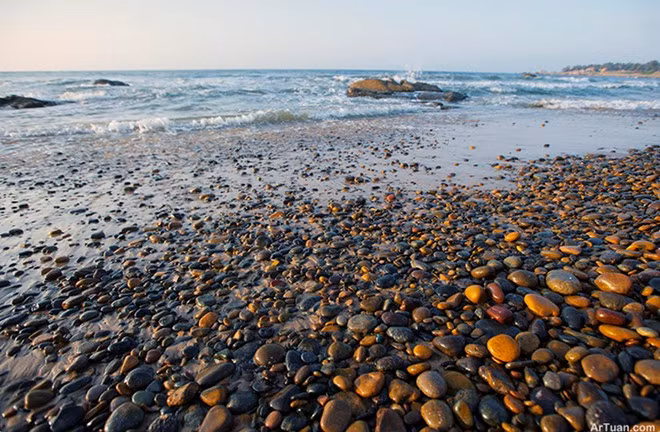古石海滩最迷人的是闪闪发亮的石滩。这些石滩由潮水、海流和海水的影响而形成的。不同尺寸的石头从海洋里被冲到海岸边,久而久之形成了这些美丽的石滩。