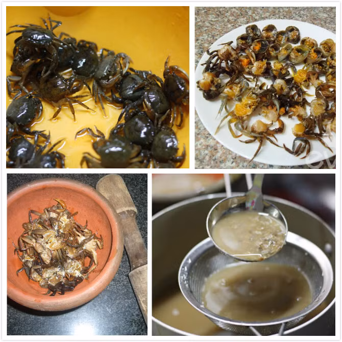 田蟹舂好了,向臼里倒进一大碗水,用手框住,将含有蟹肉的水过滤出来,倒掉被舂碎的蟹脚、蟹壳。