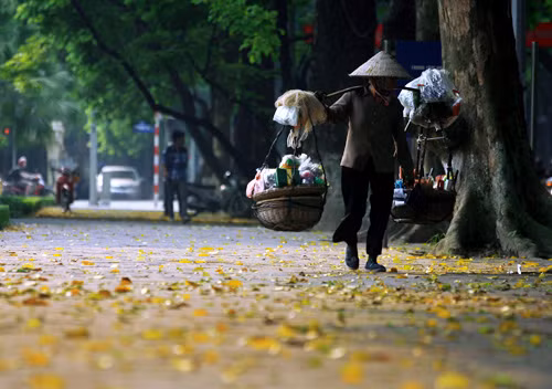 如用心观察将发现,河内沿街叫卖的小贩在每个季节里都会有不同之美。当夏季过去,秋季来临,直到冬季初期,许多人喜欢欣赏那些上边放满太阳香味的红莲花、黄菊花的花担子。到秋季中期,河内人将看到街上带着绿糯米摊的绿色,柿子的红色等。