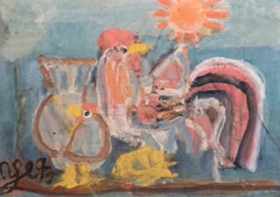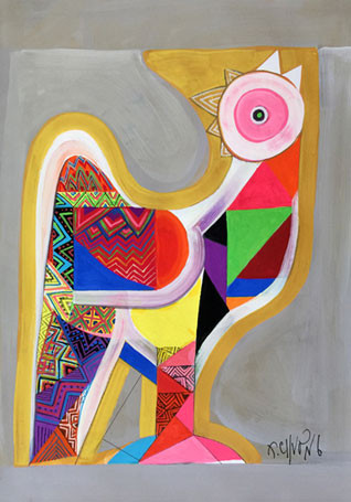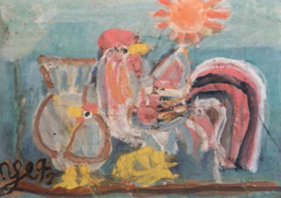 在鼓街民间画作品中,鸡形象经常与牡丹花相伴,展示对寻找一种安乐、清净生活的愿望,体现了君子面对大自然的气质。而在金黄画的作品里,鸡画、蛇画则与信仰有关——神鸡除邪,鸡画是用来祭祀的。过节期间挂上金黄鸡画,以求安详和幸福。