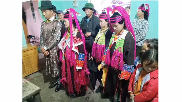 举行婚礼的那天,新郎祭拜祖先后男方将把两只鸡和猪肉送到女方。婚礼在前一天晚上到第二天晚上从女方到男方连续举行,包括男方迎亲团与女方对唱、结缘式、接受男方送来的彩礼、揪新娘等仪式。新郎和新娘用一块面纱蒙在脸上在新娘家厨房跟媒人和巫师实现祭拜仪式。