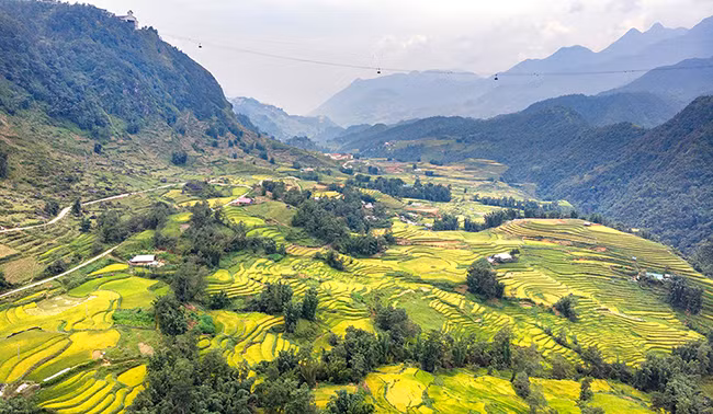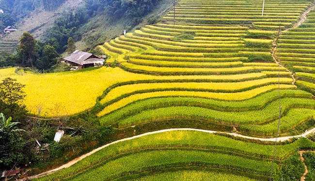 位于越南老街省沙巴镇的芒花山谷正处于年中最美的季节。芒花山谷梯田遍地染黄勾勒美丽田园画卷,吸引了游客的眼光。