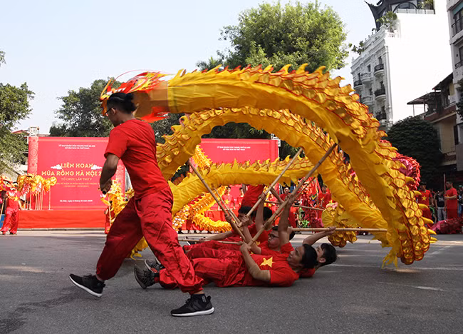 河内市15个郡县的龙舞队参加联欢会。龟龙鳞凤(传统上用来象征高寿、尊贵、吉祥的)四种动物的颜色与各龙舞队的服装让还剑湖步行街空间变得热闹非凡。众多外国游客和四面八方游客兴高采烈地观看各郡县的龙舞队演出。