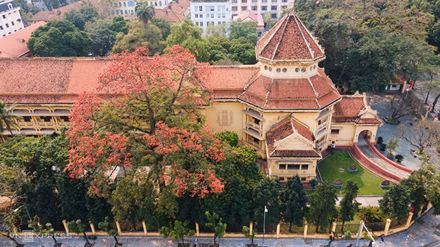 位于河内首都、距离环剑湖不到一公里,越南国家历史博物馆被木棉花染红了。这里的木棉树高达30米多、树桩直径近一米。