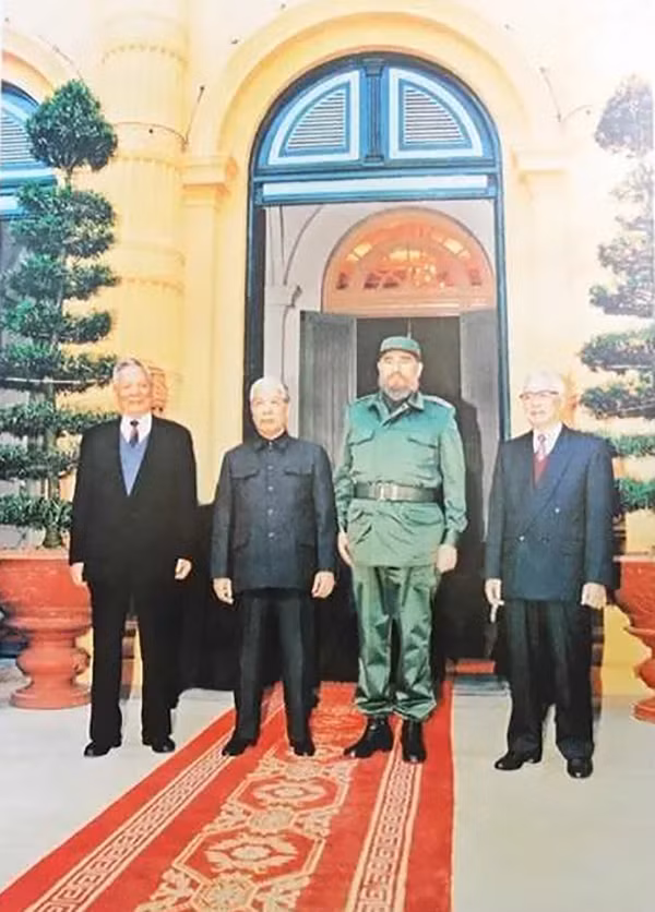 菲德尔·卡斯特罗主席和越共中央总书记杜梅、越南国家主席黎德英、越南政府总理武文杰1995年合影。