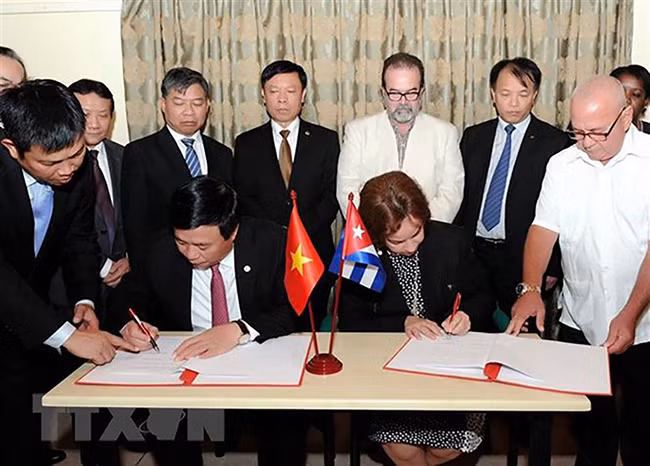 越南军医代表团同古巴军医代表团签署合作备忘录。(图片来源:越南友好组织联合会)