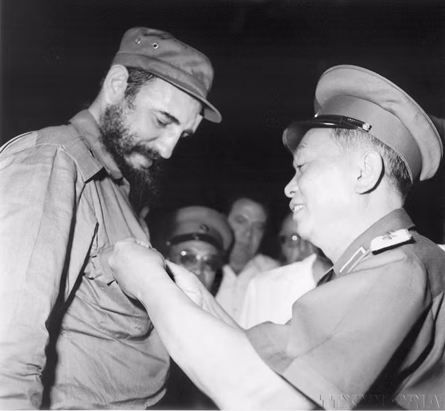 武元甲大将1973年在河内向菲德尔·卡斯特罗同志授予“奠边战士”纪念章。
