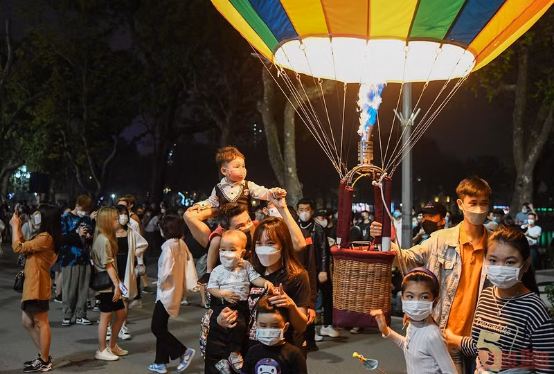 3月25日晚,数千人前往河内市还剑湖步行街观赏五颜六色的热气球。