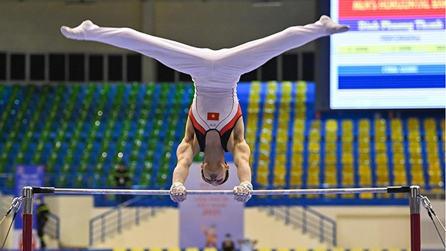 越南运动员丁方成在男子双杠比赛中秀精彩动作。