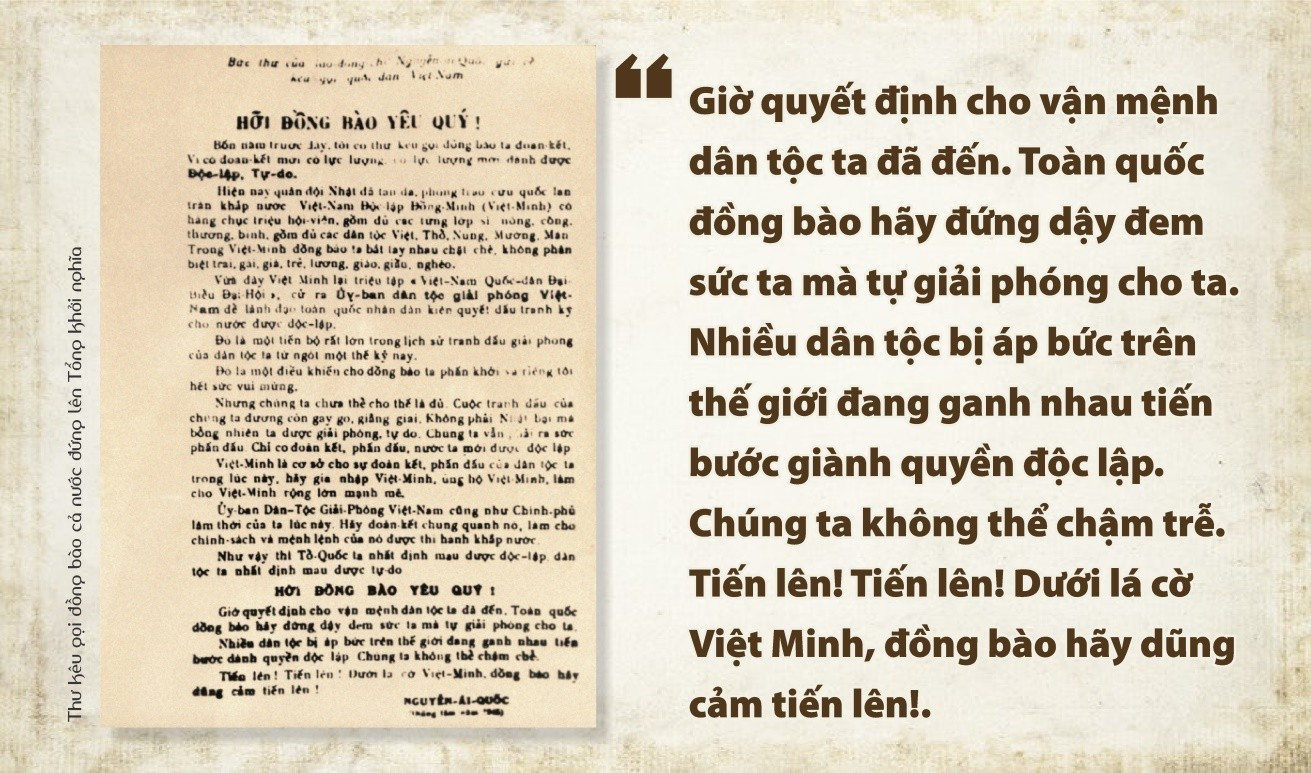 胡志明主席在号召书中郑重向全国同胞宣布,日本宣布投降,越盟阵线力量日益壮大,“越南国民代表大会”成功选举产生越南民族解放委员会。这一历史性进展,被胡志明主席高度评价为“近一个世纪以来我国民族解放斗争史上的一个重大进步”。