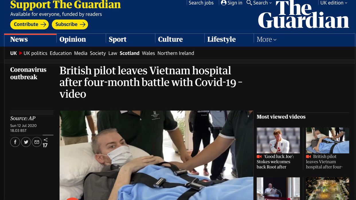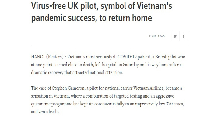 5月底,当英国籍的第91号患者正处于危险状态时,苏格兰《每日邮报》刊登题为“越南顶尖医生为拯救43岁的英国飞行员的生命而争分夺秒”的文章。英国《金融时报》5月23日发表文章称,诊治英国籍的第91号患者已成为越南政府和卫生部门的优先事项。