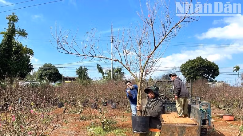 在接近春节的日子里,这里的桃农精心准备了最漂亮的桃子盆栽和树枝服务于省内人民和商人收购和运输到整个南部省市,其中包括胡志明市、岘港、芹苴、平定和庆和等大省市,为人民欢庆温馨快乐的春节提供服务。