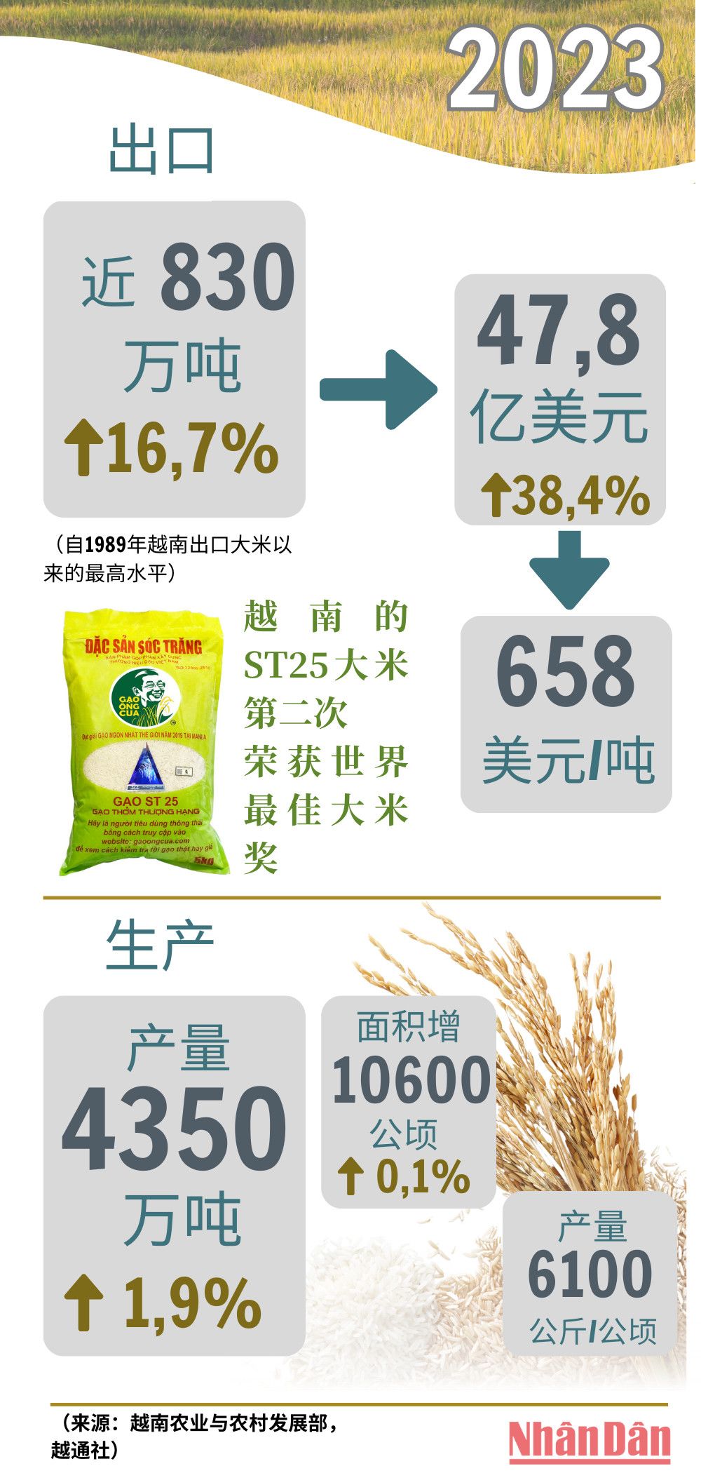 2023年是越南大米产业取得巨大成功的一年,出口量创历史新纪录,达近830万吨(比2022年增长16.7%),出口额达47.8亿美元(同比增长38.4%)。 从而继续肯定越南大米品牌在国际市场上的地位及其为全球粮食安全做出贡献的承诺。