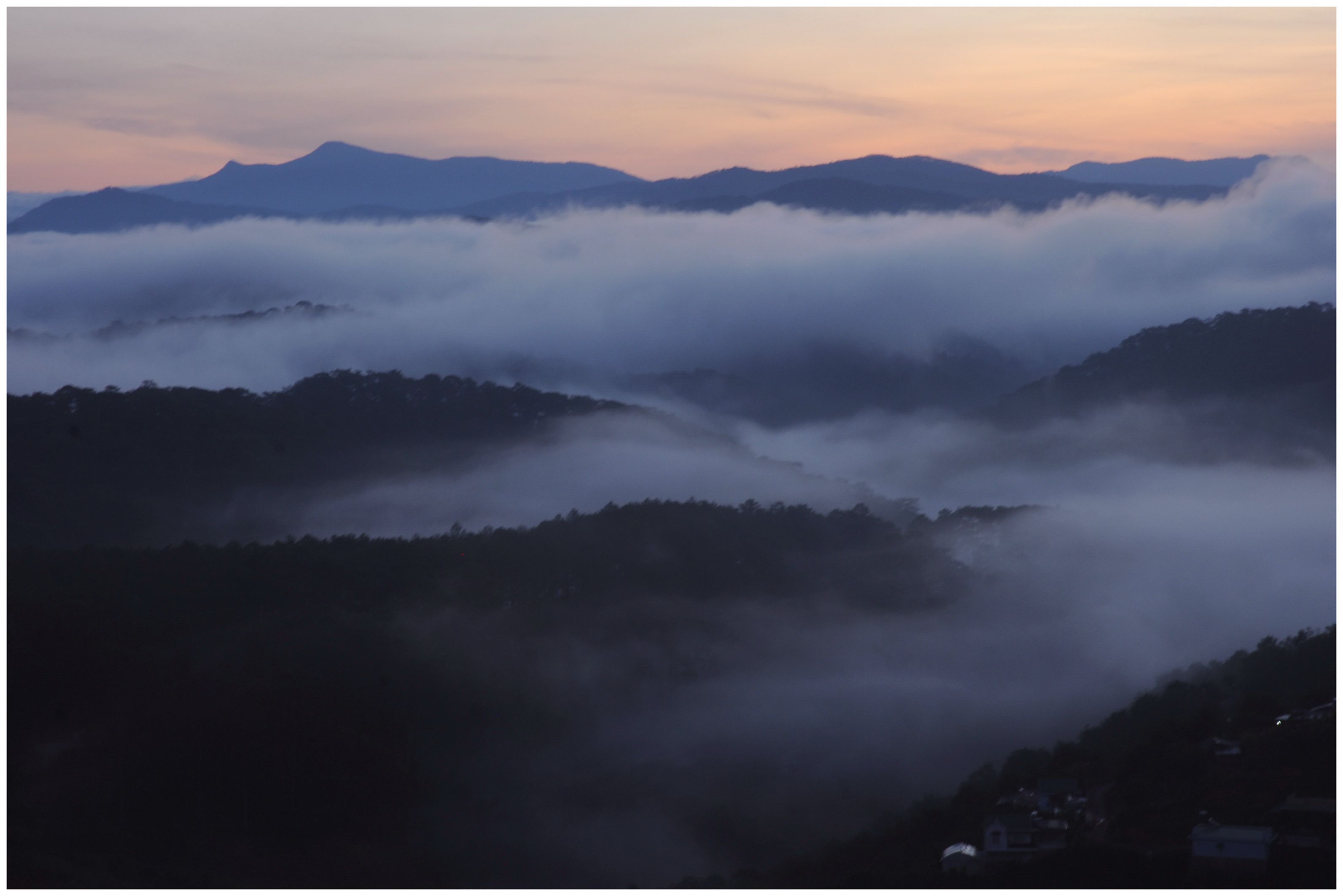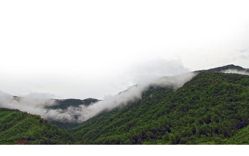 从山顶上,雨越下越大,烟雾在树林里缭绕。空间在眼前朦胧,这一边是我国山脉,那两边是柬、老两国森林。这种景色仅增进隐藏着对偏僻山区的怀念的寂寞。