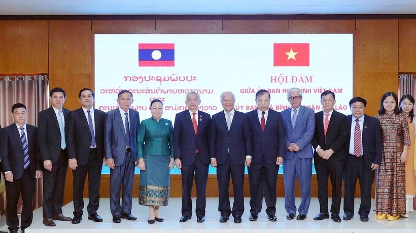 2024年8月22日,由前越南国会副主席、越南和平委员会主席汪周刘率领的越南和平委员会代表团与由老挝国会副主席、老挝和平与团结委员会主席宋玛·奔舍那率领的老挝和平与团结委员会代表团举行会谈。(图片来源:Quochoi.vn)